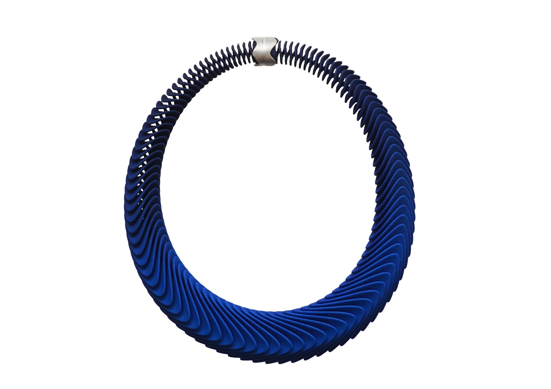 The necklace makes use of the flexible nature of 3D-printed nylon to create a tactile and flexible piece that comfortably follows the contours of the neck. The piece has visual impact thanks to its volume yet is very light and easy to wear.