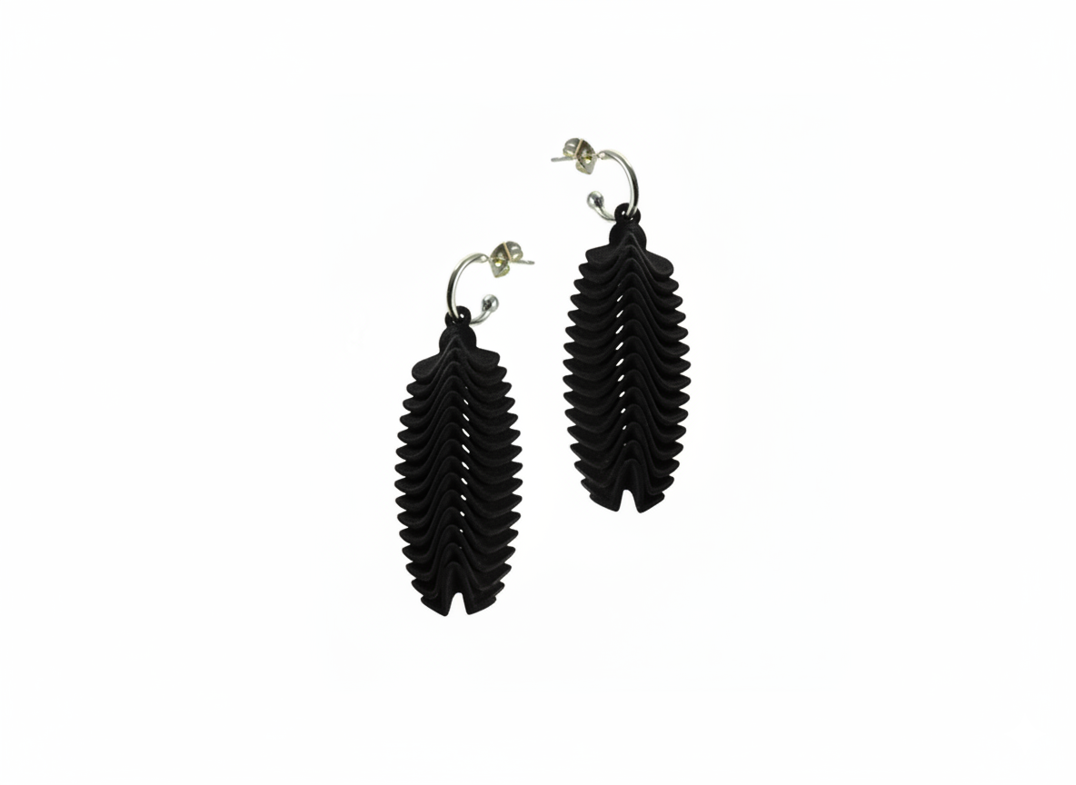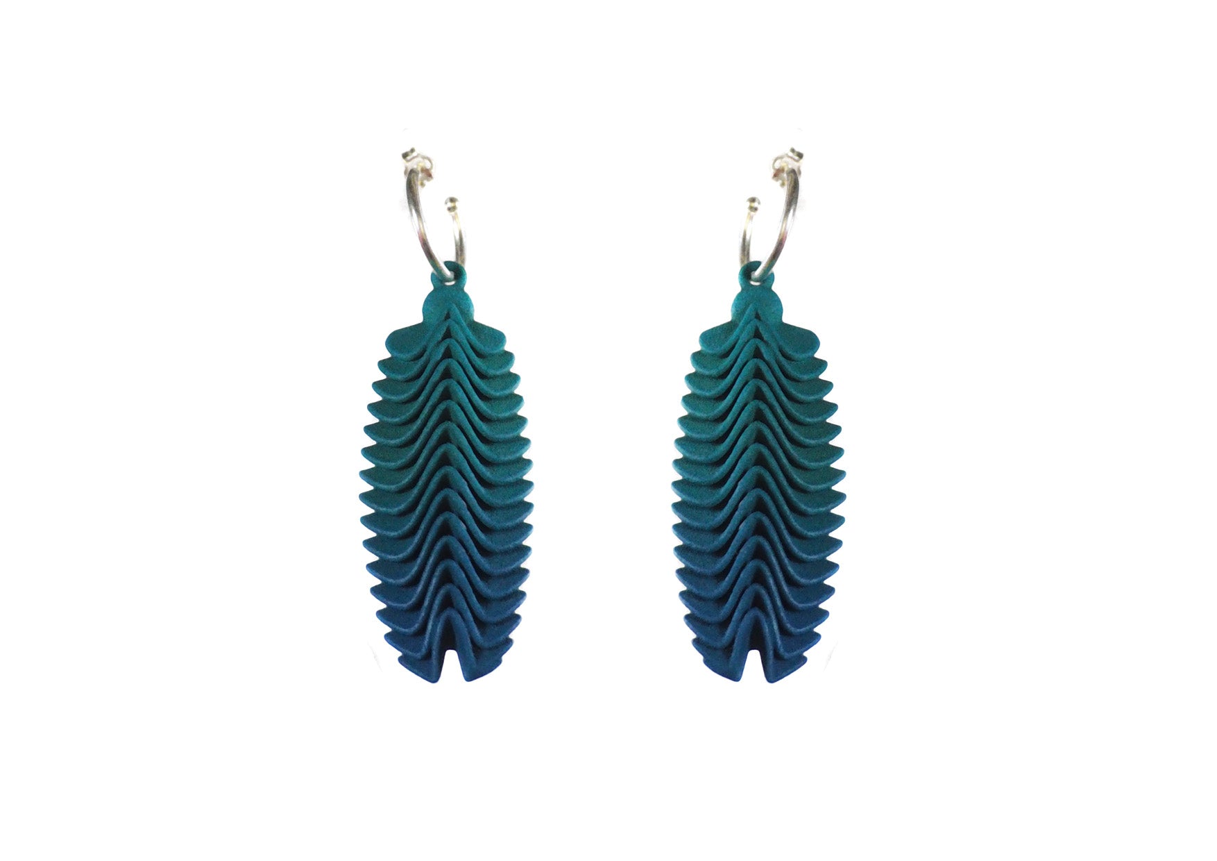 Hand-dyed 3D printed nylon, a light yet strong and durable material with a smooth matt finish. Solid sterling silver 12mm hoops with silver butterfly back. Drop Size - 2 x 5 x 1 cm