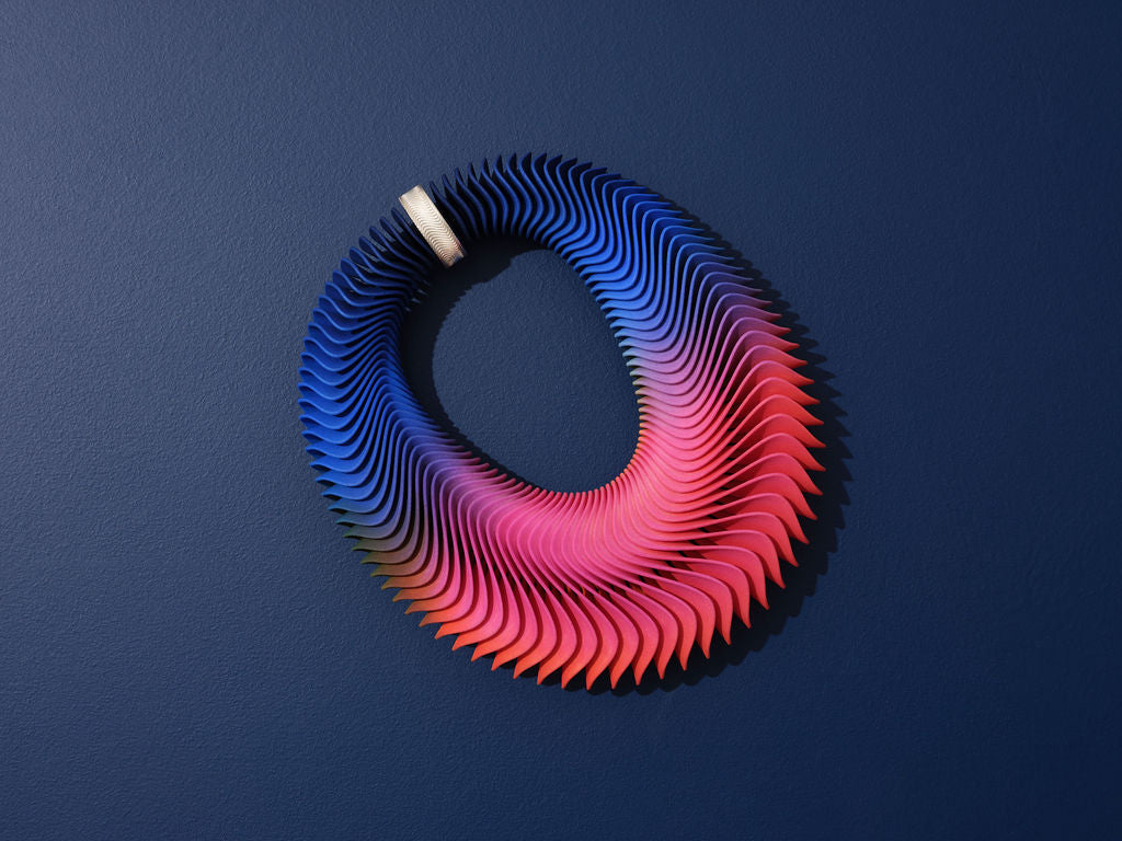This necklace features a gently graduated wave motif and carefully graduated hand-dyed colours. The necklace is double-sided, offering two ways to wear it and a gentle glow of the reverse colour, creating an intriguing effect. Based on harmonic geometry, the form gives a pleasing sense of rhythm and calls to mind patterns from the natural world.