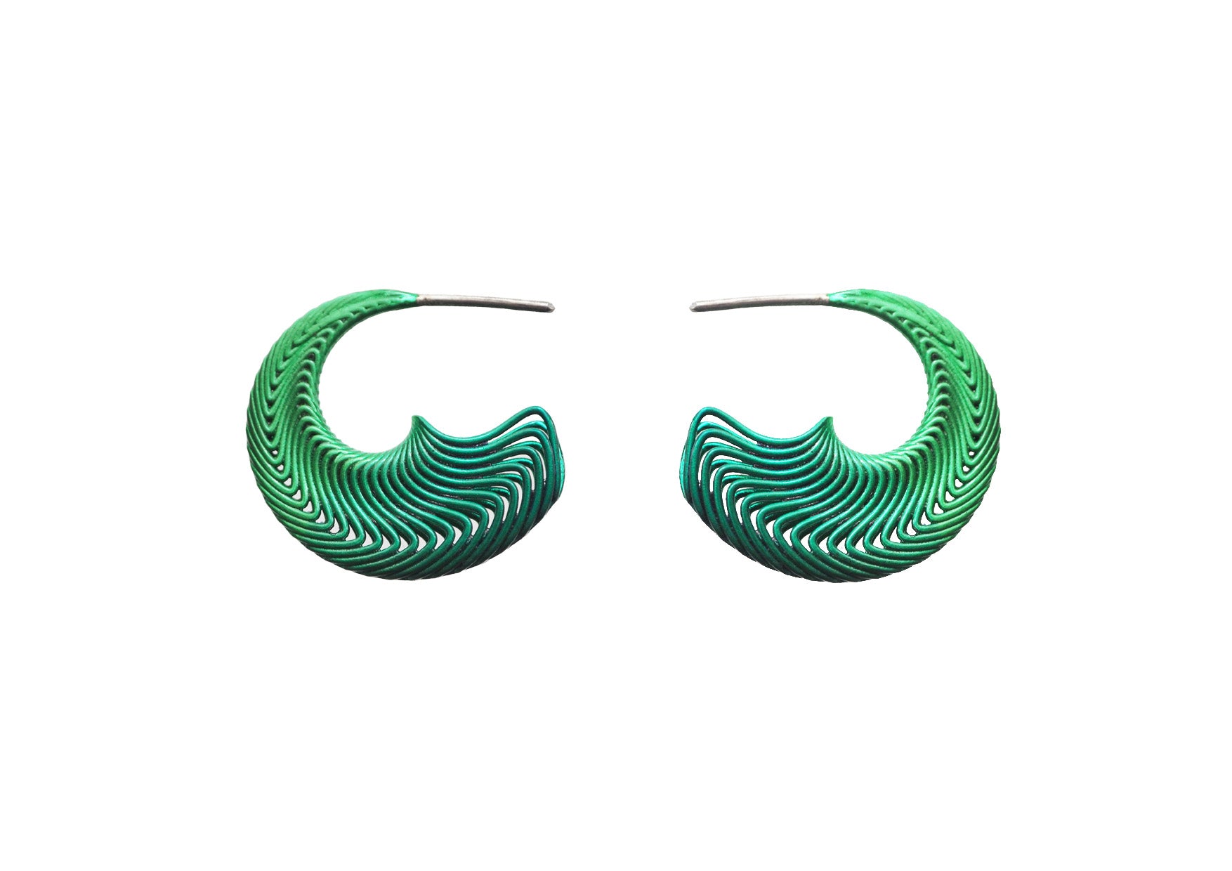 The pattern flows around the curved shape, creating a hollow piece, making the earrings double-sided, slimline and light but with a small amount of volume.