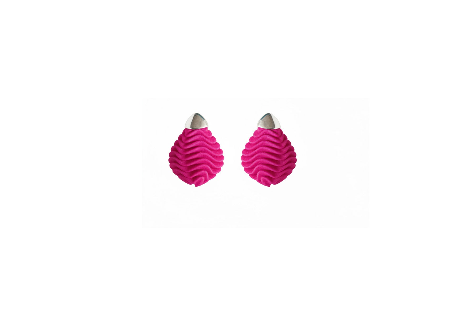 Petal-shaped earrings, comprised of undulating wave patterns with hand-dyed colour. These are light on the ear, with highly polished bespoke silver post fittings for an added touch of luxury.